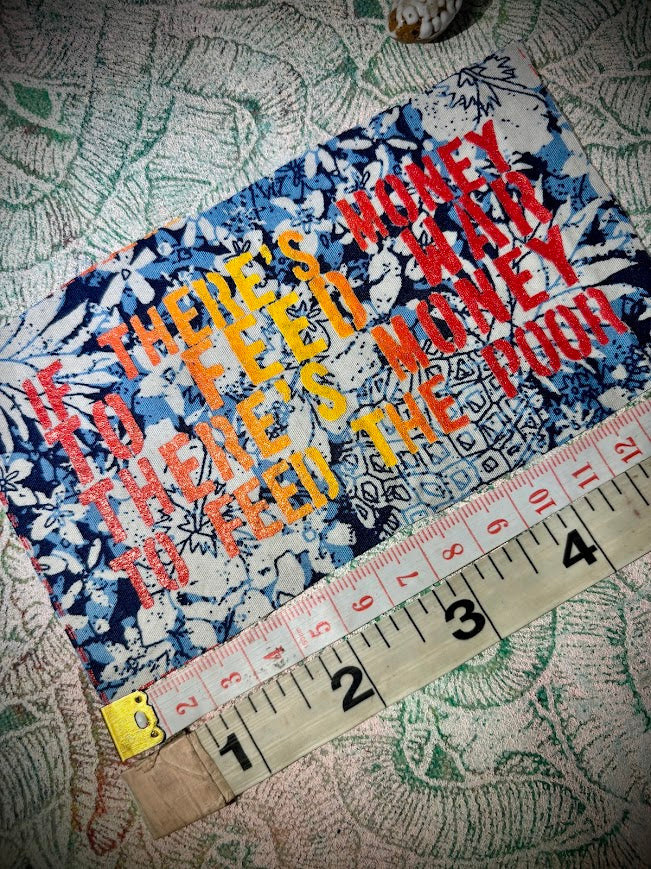 All patches are hand drawn, silk screened, hand made by me. They are safe to go in the washer, but may fray a bit, depending on how you sew it. Do not iron directly on the ink, it's best to iron from the backside, with a piece of fabric or paper between the iron and the patch. Black and natural fabric is a heavy weight cotton canvas. Any other fabrics are either upcycled from old clothing, or thrifted and will vary in weight and may show slight sings of wear.