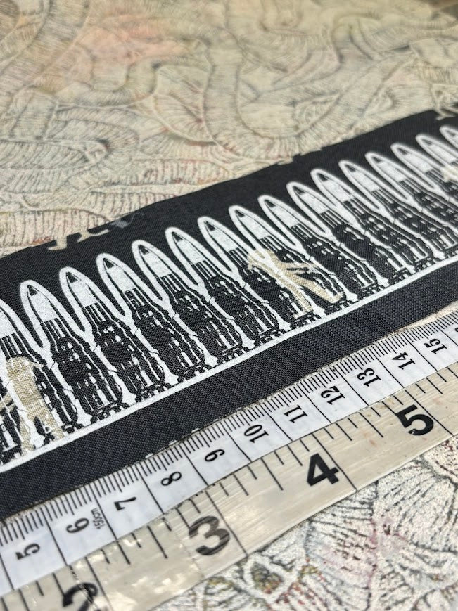 It's like a bullet belt, but in patch form. it's pretty long (12"), so it'll stretch across your back, or whatever you decide to sew it to.